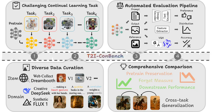 - Unified benchmark for continual post-training: Introduces T2I-ConBench as a comprehensive benchmark specifically designed for continual post-training of text-to-image diffusion models, rather than generic continual learning or one-shot fine-tuning.